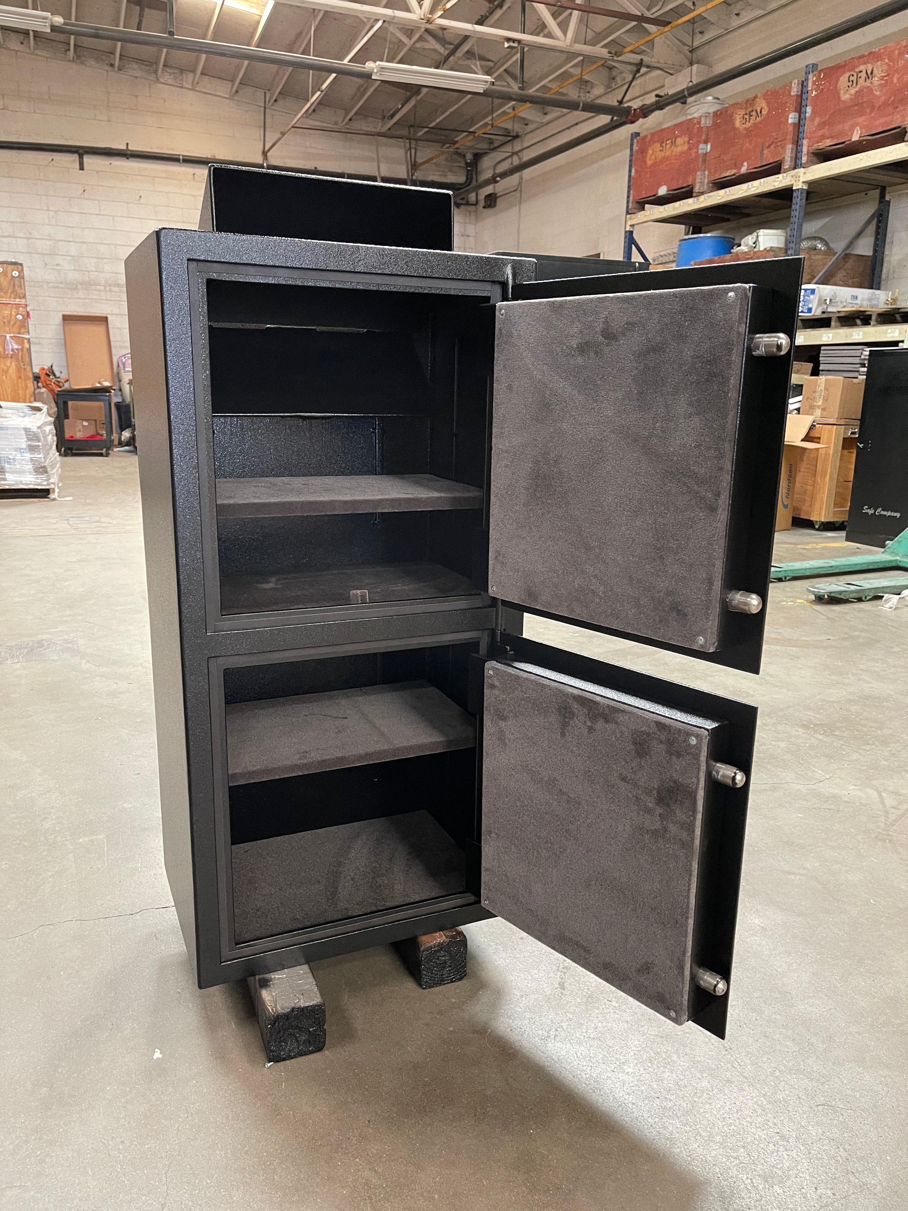 A cash drop safe is a safe for sensitive business storage. It lets workers or clients put in cash, checks or valuables, without access to the safe's inside. This aids in theft prevention and keeps the cash secure. The cash stays secure until it is counted or moved to a bank. Standard sizes for cash drops are 20” deep, 24” wide and 60” tall. Custom sizes exist to allow your cash drop to fit in specific spaces.